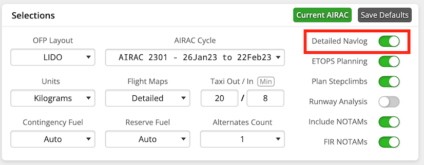 This setting is available when generating a new dispatch. Additionally, we recommend that you save any of your preferred settings here, including Detailed Navlog as the default by clicking on Save Default. This ensures that this setting is never disabled when generating a new OFP.