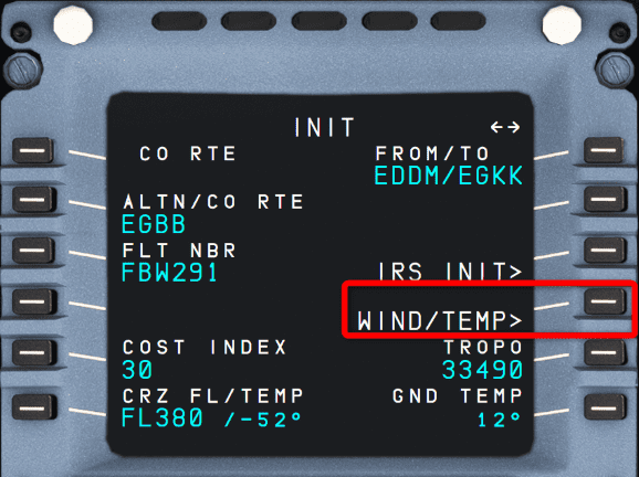 On the INIT A page, select WIND/TEMP by pressing LSK4R. This brings you to the CLIMB WIND page.