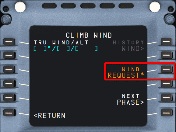 To request the wind data from the SimBrief flight plan, select WIND REQUEST by pressing LSK3R. This will calculate the wind profiles during the climb phase based on the SimBrief-provided wind data.
