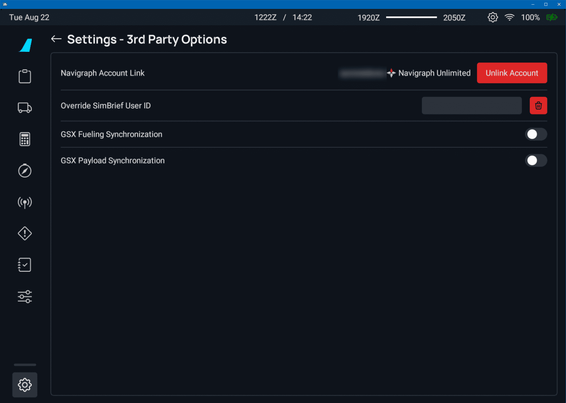 Please use the Quick Links to jump to any relevant section. For connecting your SimBrief/Navigraph Accounts, click the button below.