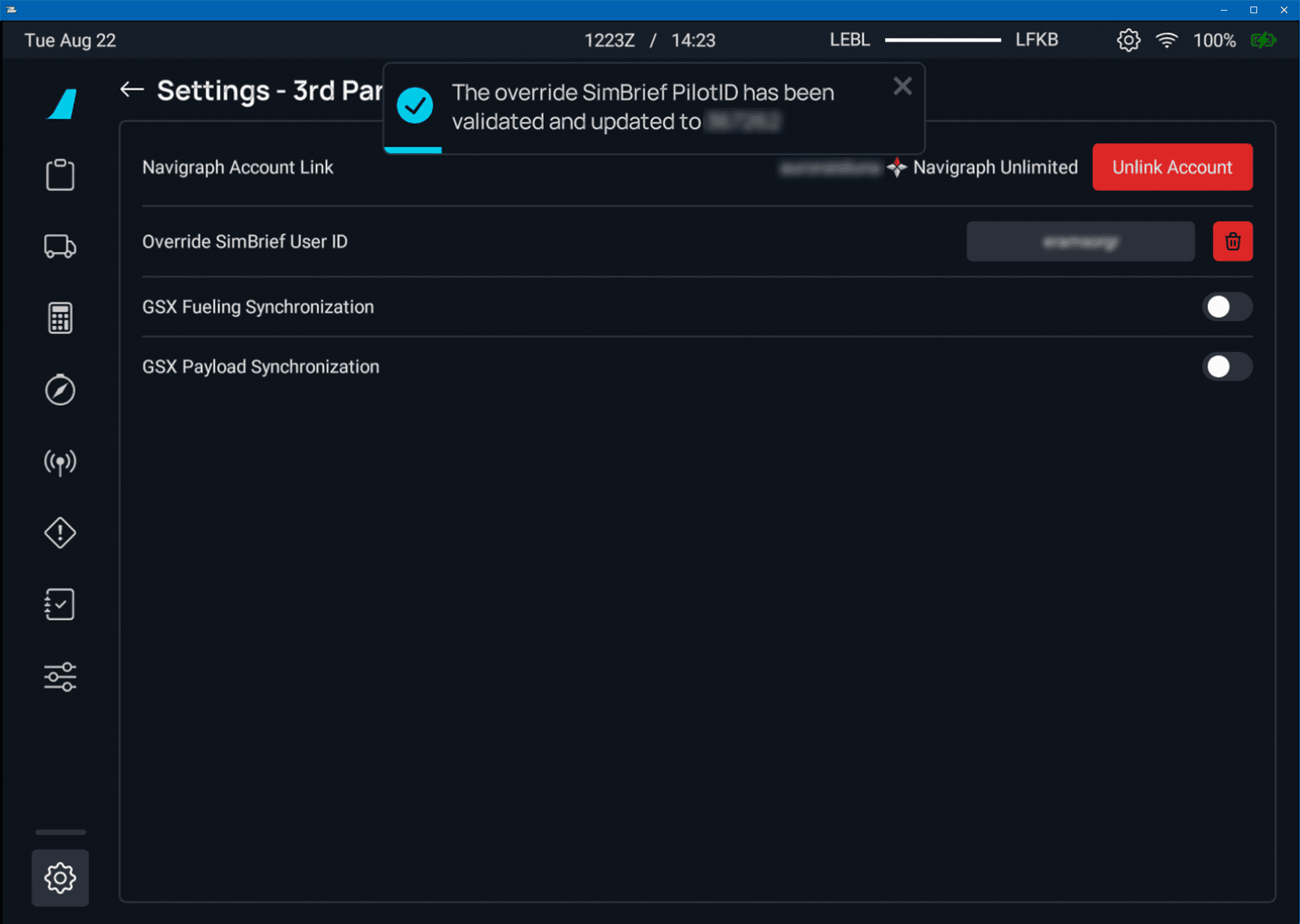 In this case you can override the SimBrief User ID by entering it in the SimBrief User ID field. This will override the linked Navigraph account temporarily until it is removed. You will be notified when the override is successful with a pop up message. Example below: