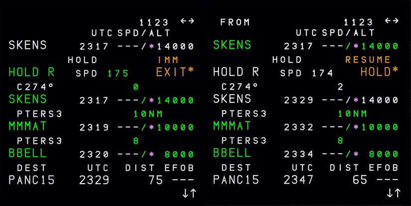 The plane will continue to fly in the hold until a pilot gives the command to the FMS to leave by either activating a direct to (DIR TO), or pressing the IMM EXIT prompt on the F-PLN page. During the hold, and prior to the hold after crossing the deceleration point, the F-PLN page will display IMM EXIT prompt in amber. The pilot may press the right LSK next to IMM EXIT to leave the hold. The aircraft will shorten the hold as much as possible, fly around until reaching the hold fix, and then exit, continuing with the subsequent flight plan. At any time prior to reaching the hold fix, the RESUME HOLD prompt may be used to re-enable the hold.