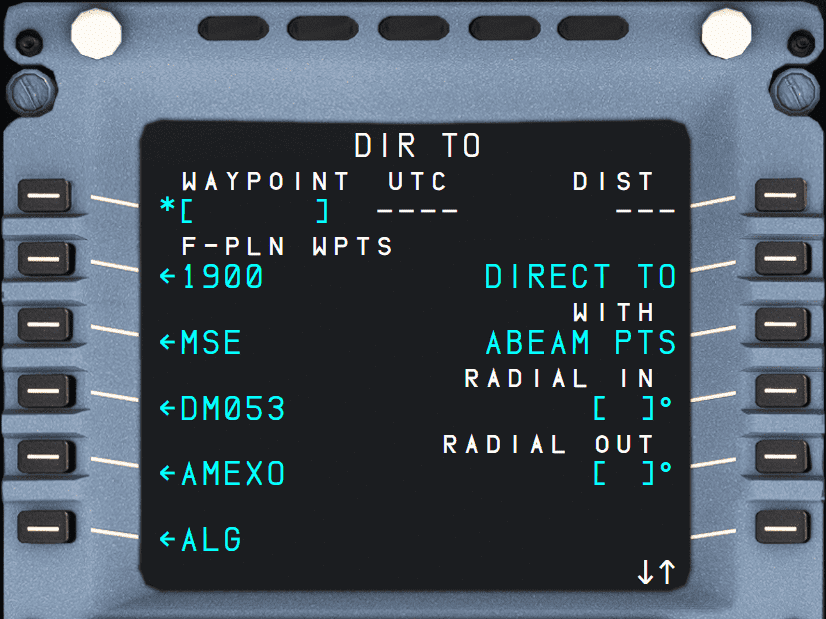 The DIR TO page is used by the flight crew to select waypoints from the flight plan or to enter new waypoints to modify the current active flight plan by creating a direct leg to the selected/entered waypoint.