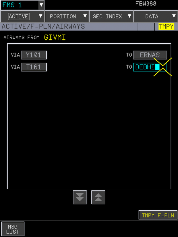 FLT NBRfield so a blue typing cursor appears in the field. - Using your keyboard, type the flight number you want to use (e.g. "FBW388") and press the